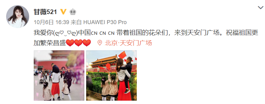 甘薇最新的一条微博停留在10月6日,展示的是一个带娃出游庆贺国庆的母亲形象。